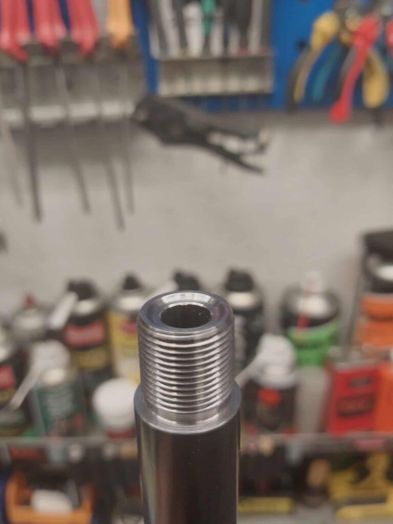 Vi har fullskala børsemakerverksted og småmotor verksted i våre produksjonslokaler. Et viktig tilskudd er helt ny dreiebenk for effektiv og nøyaktig dreining og gjenging av piper. Viktigheten av skikkelig arbeid på gjengene når man skal ha ny lyddemper er en av Snorres kjepphester.